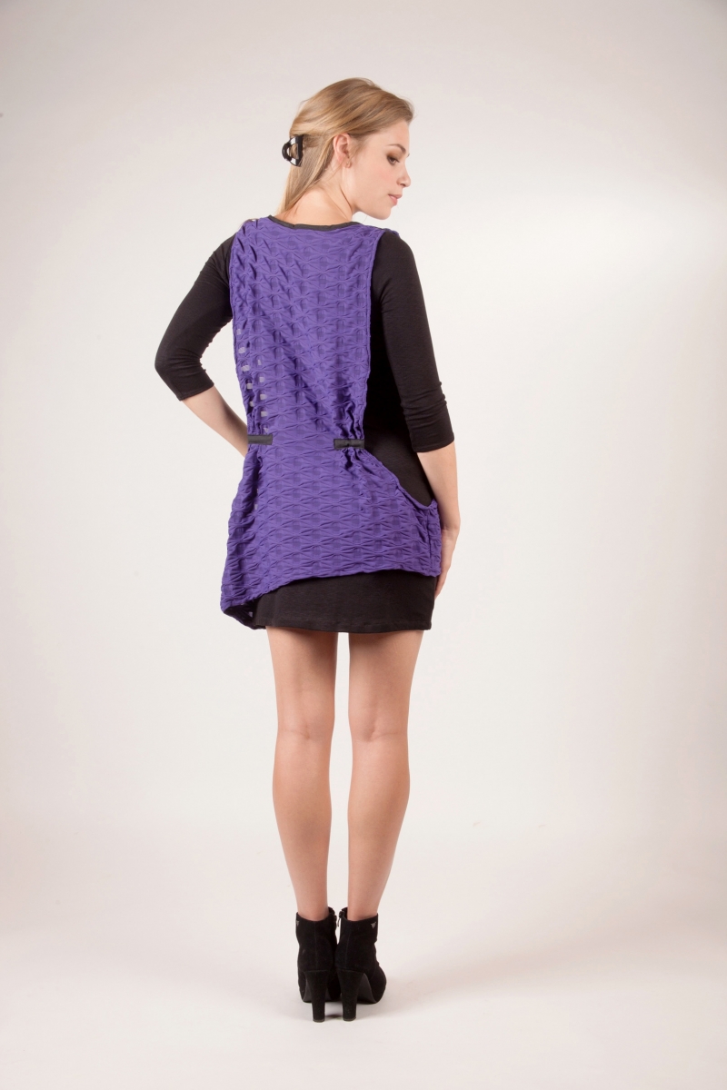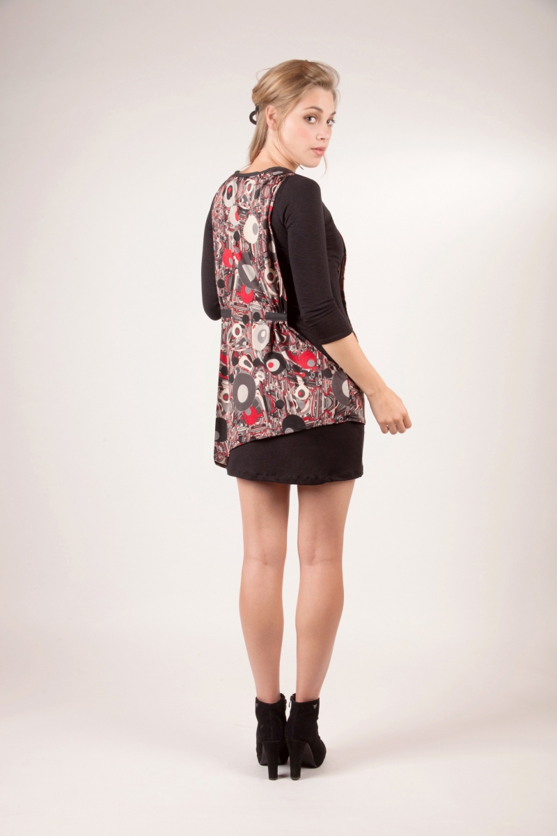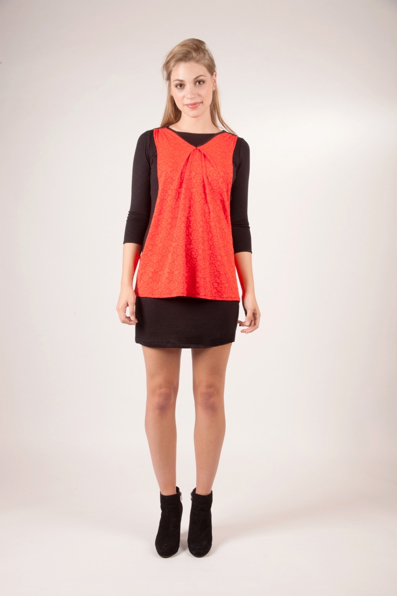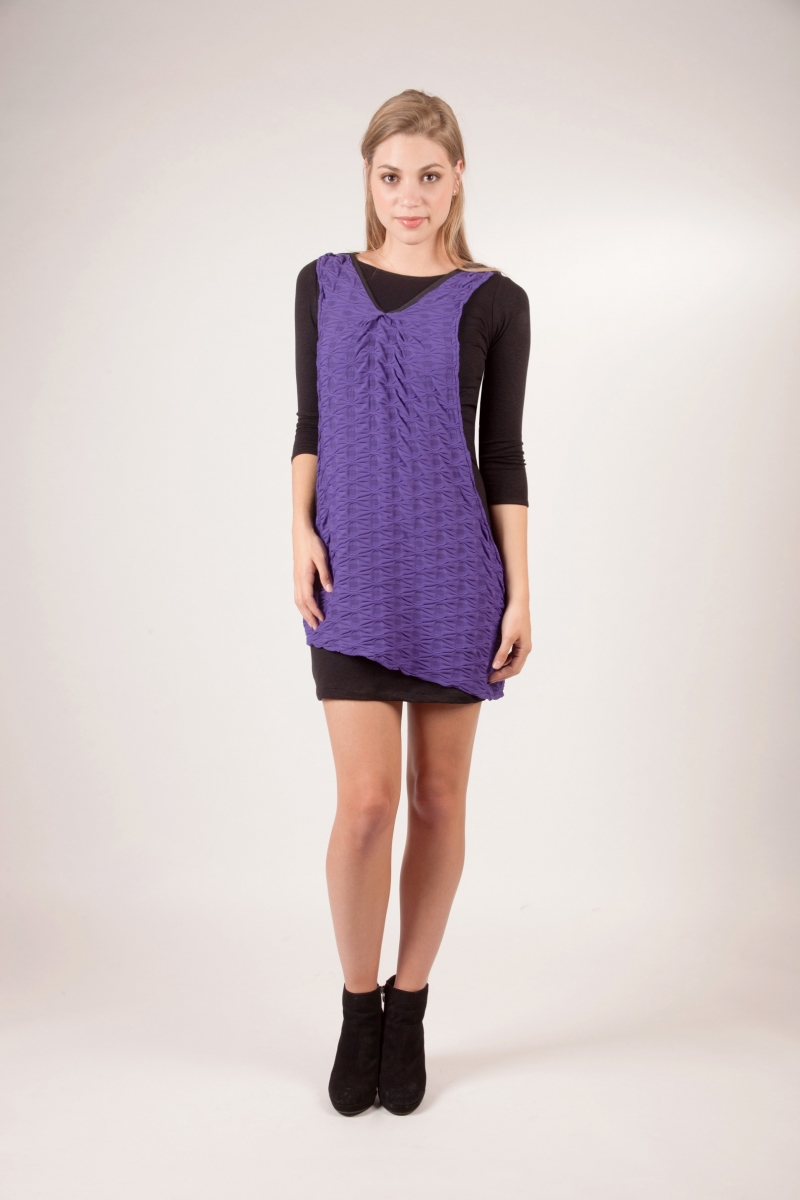 Sur une robe près du corps en coton élasthanne, une tunique fluide évolue avec légèreté : plissée sur la poitrine et dans le dos, elle habille à merveille toutes les silhouettes.