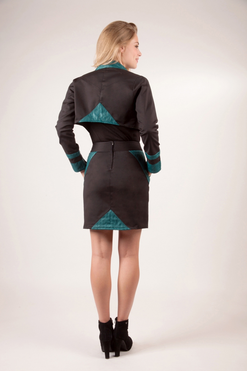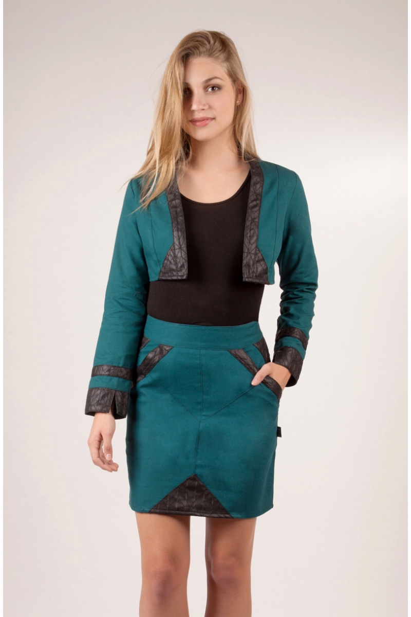 Jupe droite de coton à l’allure citadine… et à l’esprit rock’n’roll grâce au skaï qui souligne les découpes graphiques et les grandes poches à l’avant. A porter avec le boléro Lakyo..