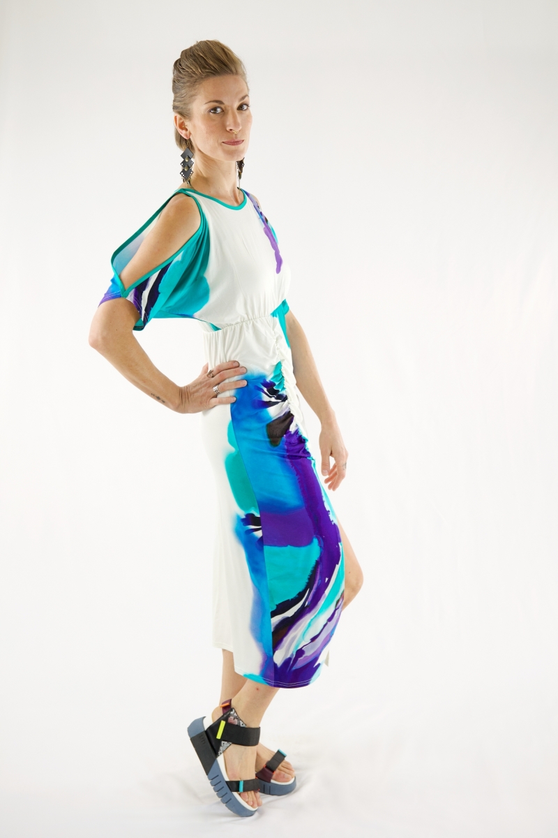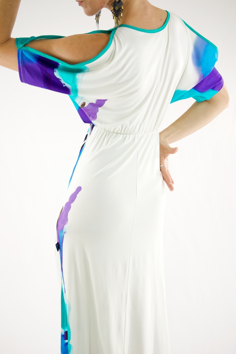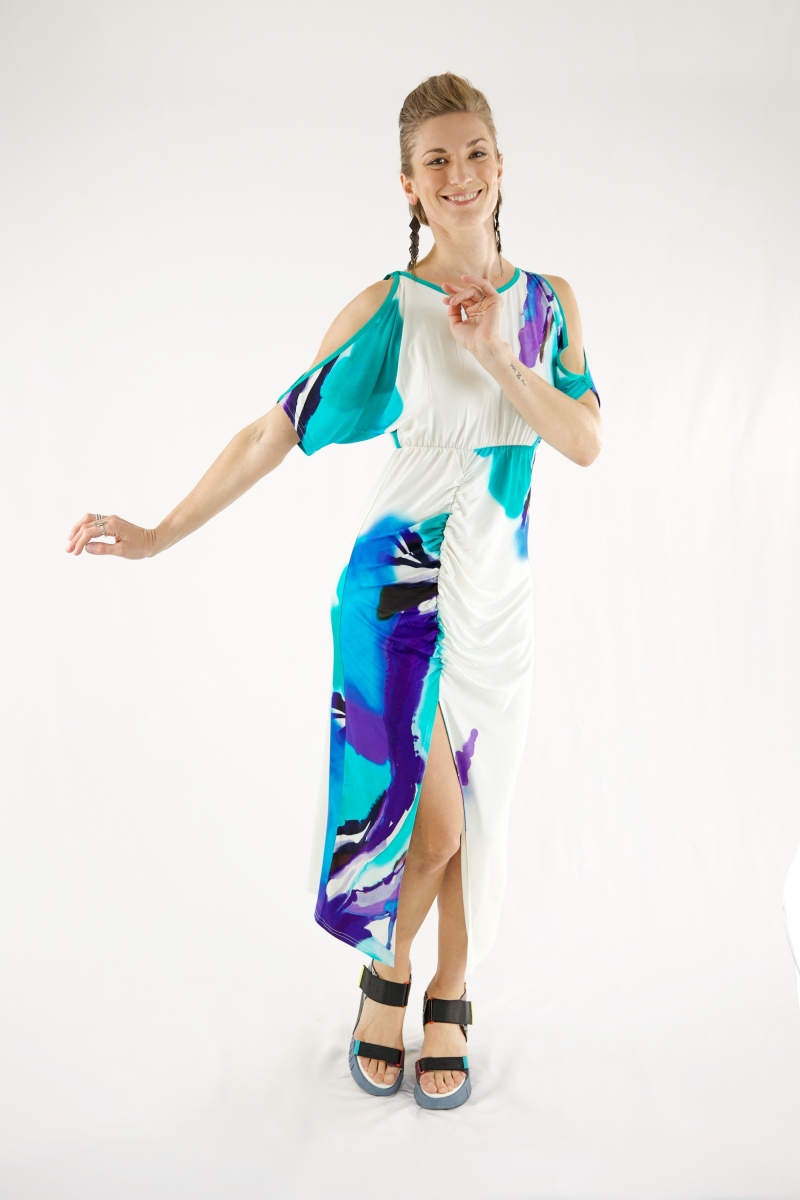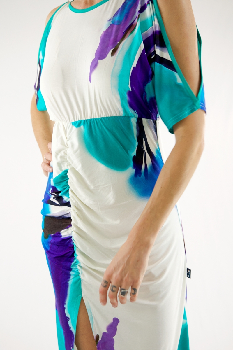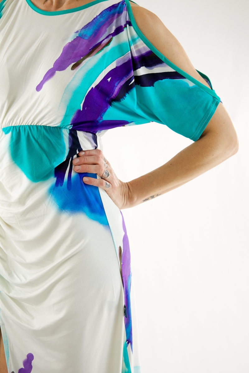 Ouverture sur les épaules, élastique au niveau de la taille et effet plissé au niveau du ventre.