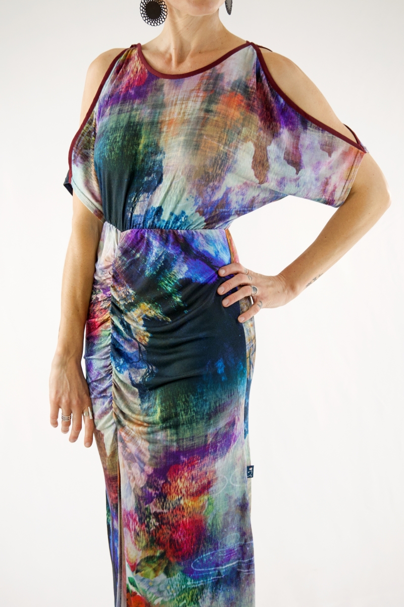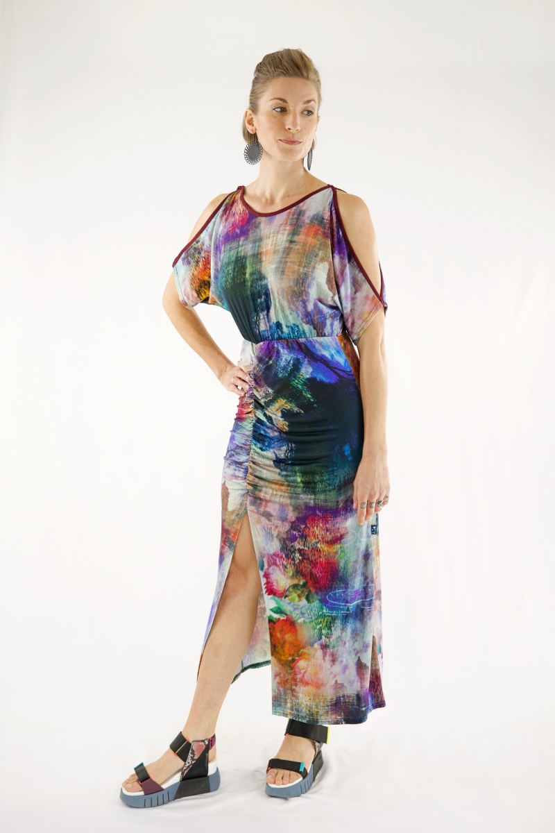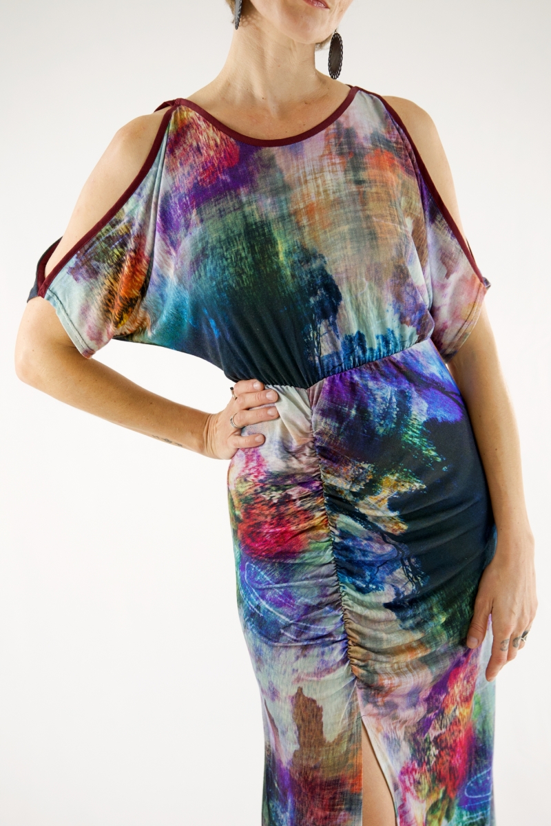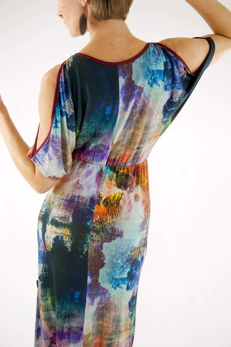 Ouverture sur les épaules, élastique au niveau de la taille et effet plissé au niveau du ventre.