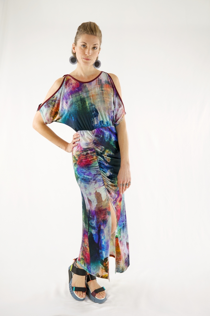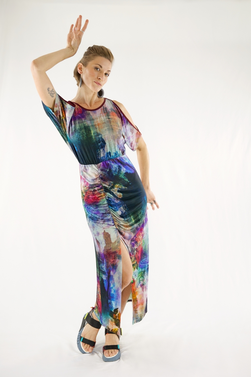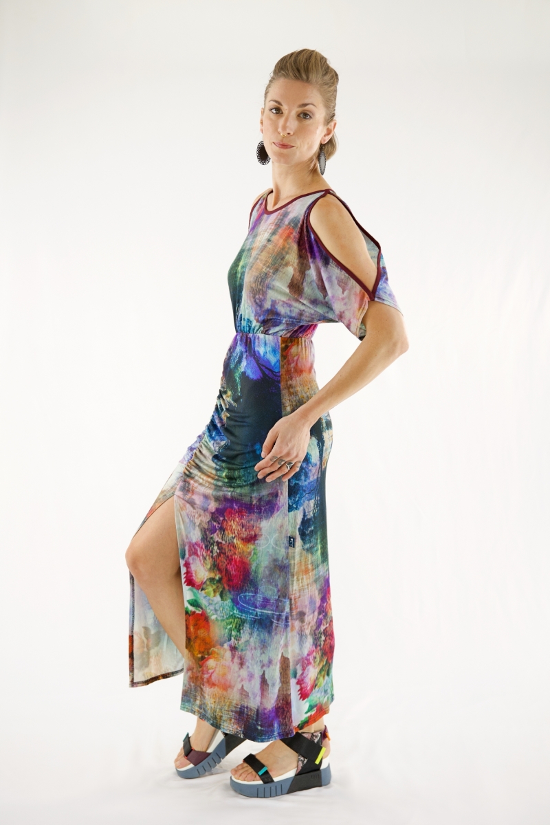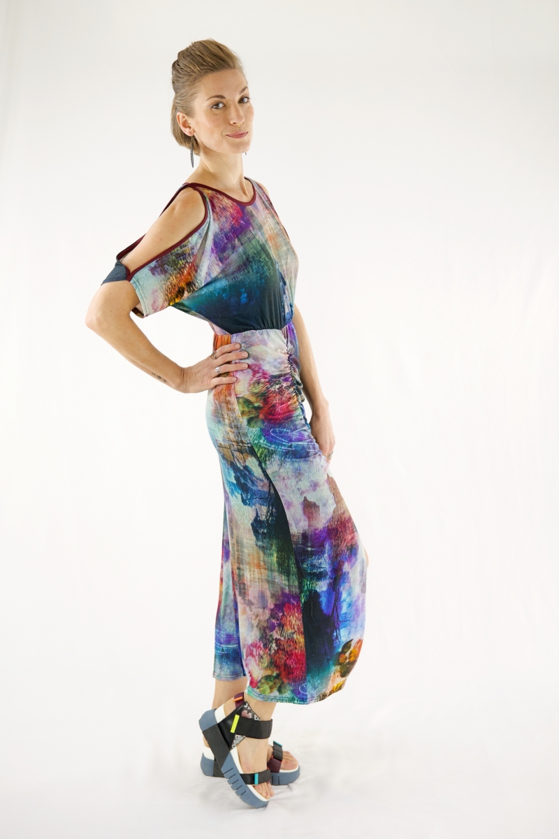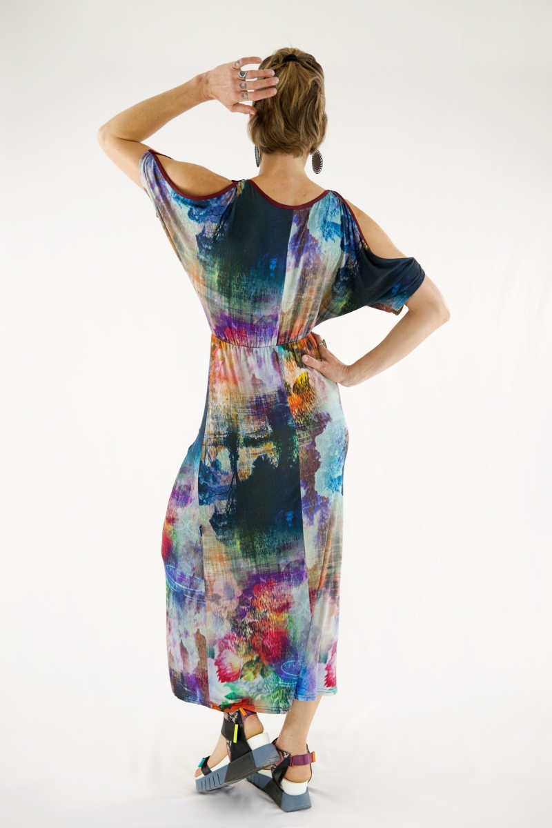 Ouverture sur les épaules, élastique au niveau de la taille et effet plissé au niveau du ventre.