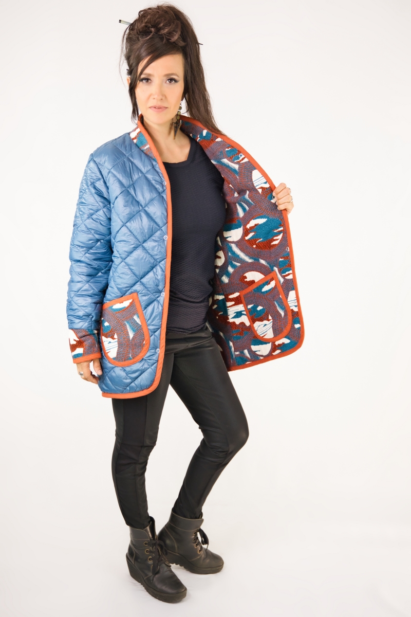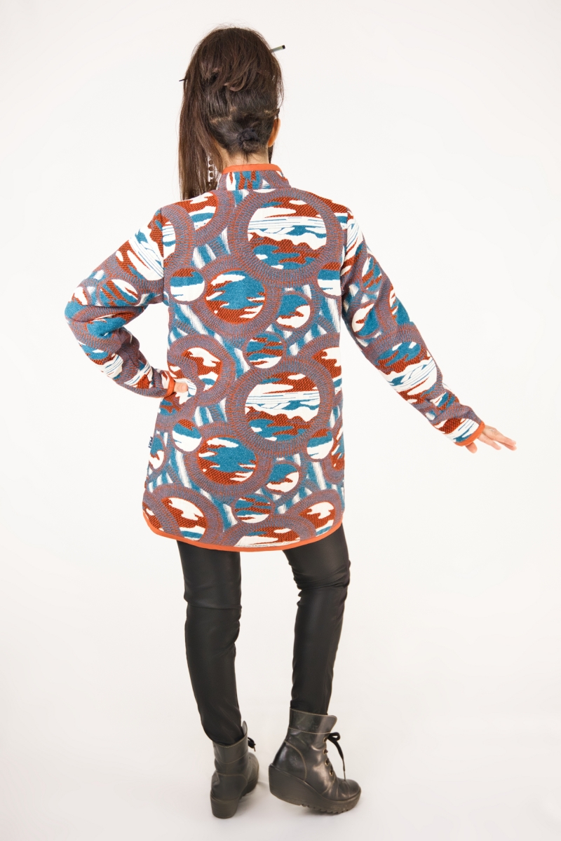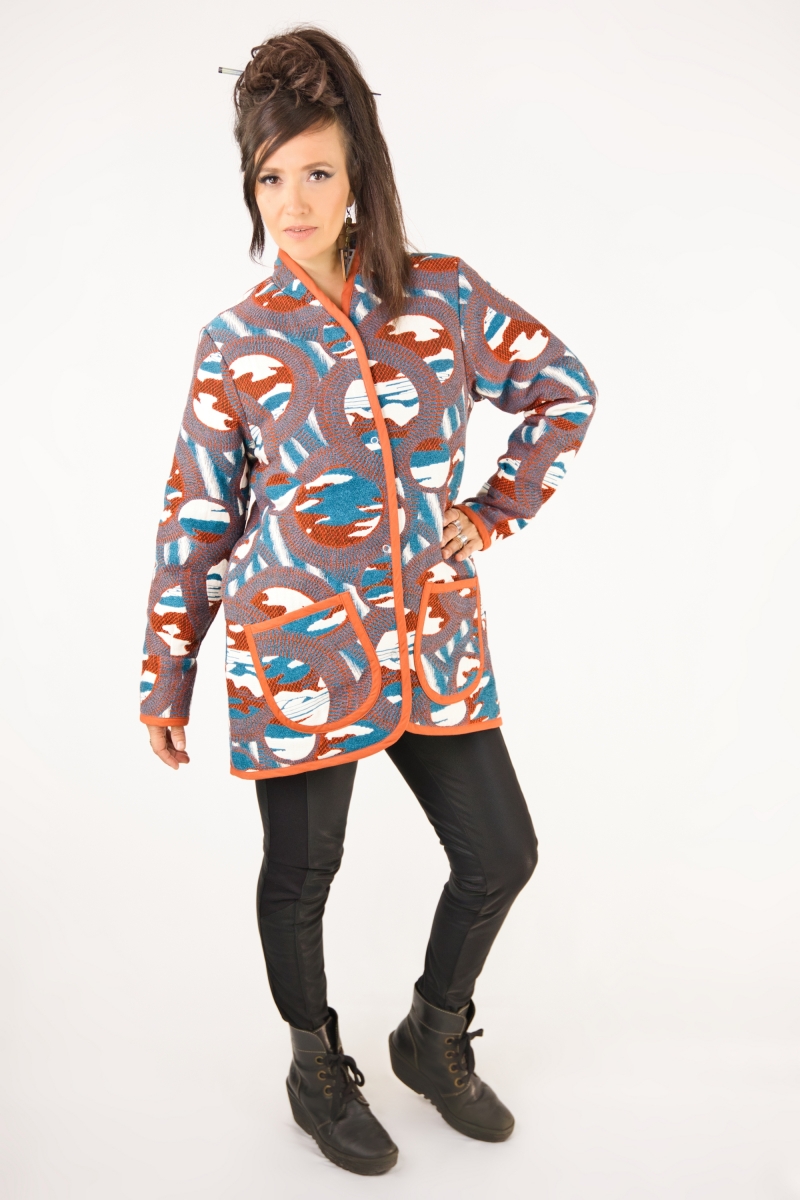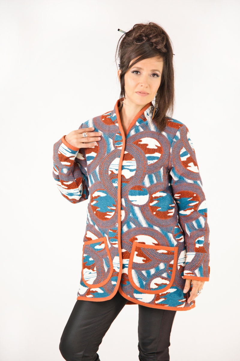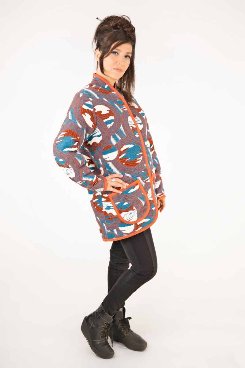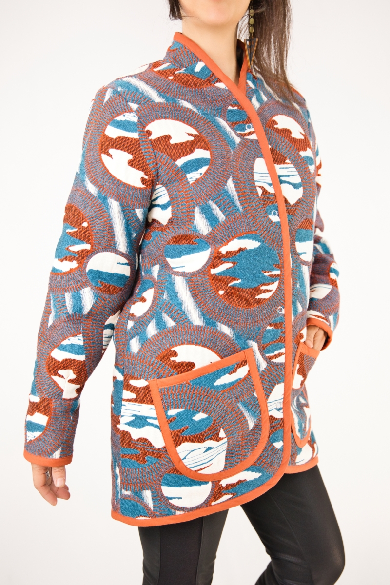 Ce Manteau d'inspiration kimono est idéal pour l'hiver: la créatrice l'a pensé suffisemment large et a choisi avec grand soin les motifs du tissu. ( Maison Deveaux )