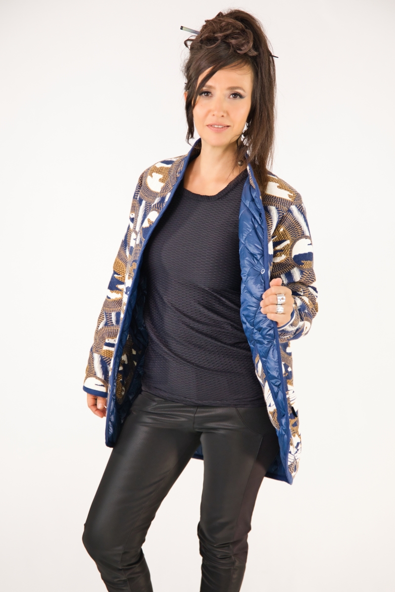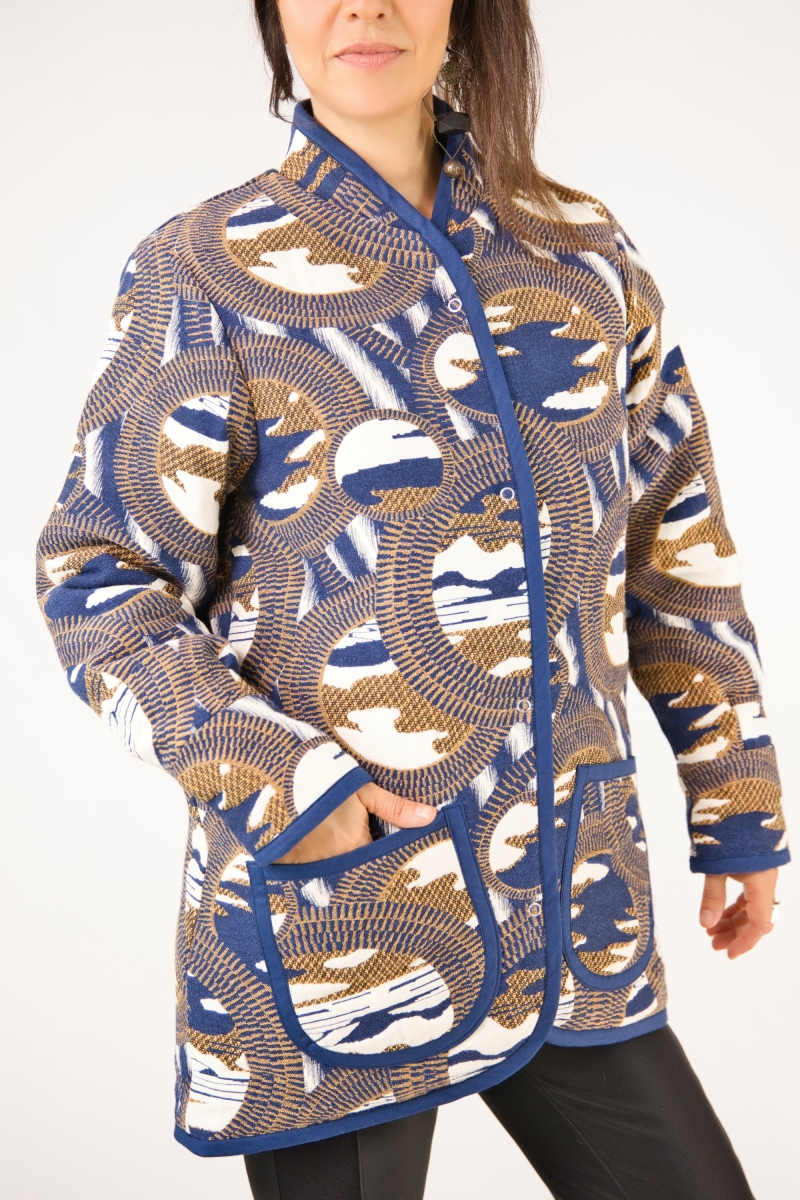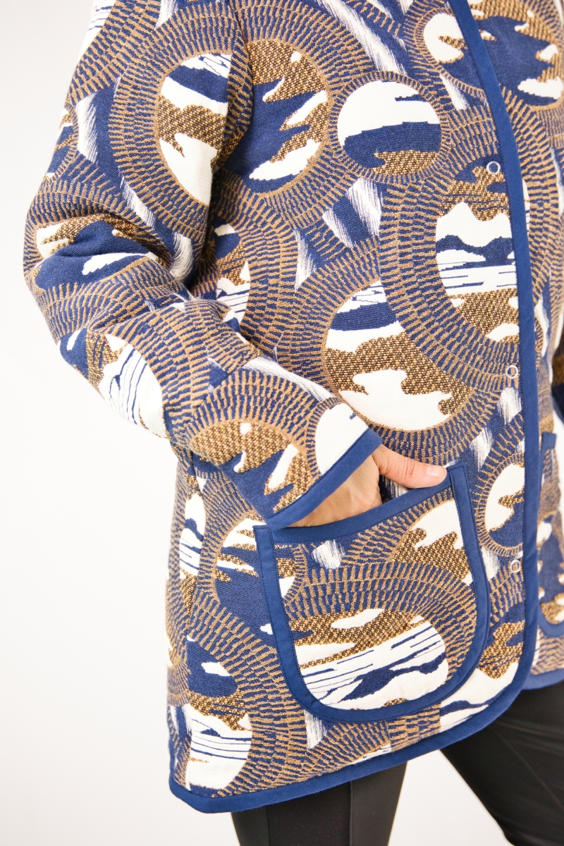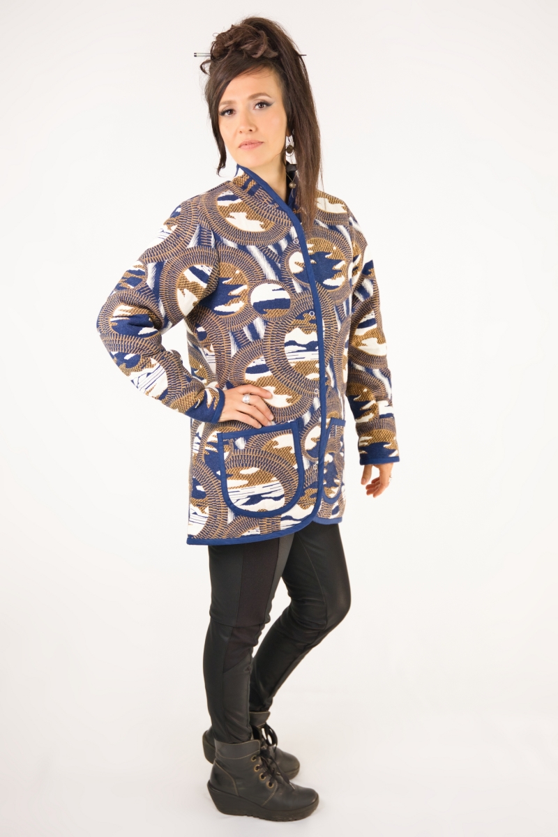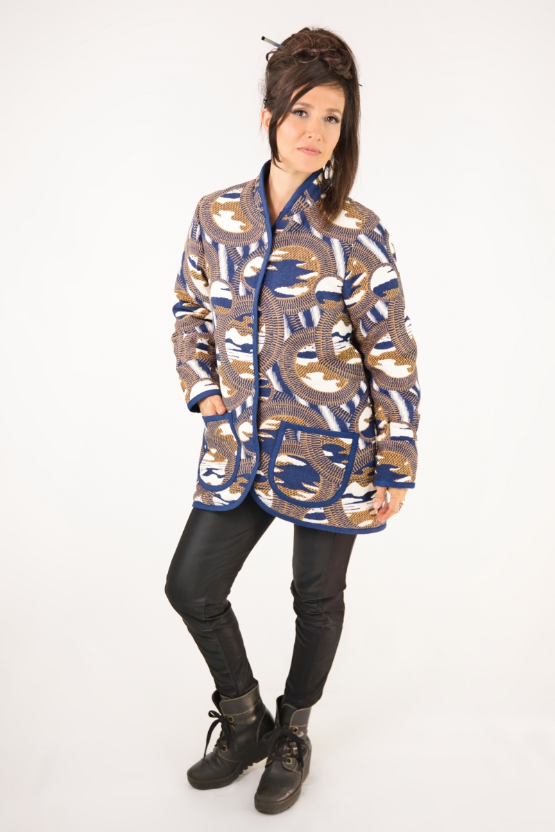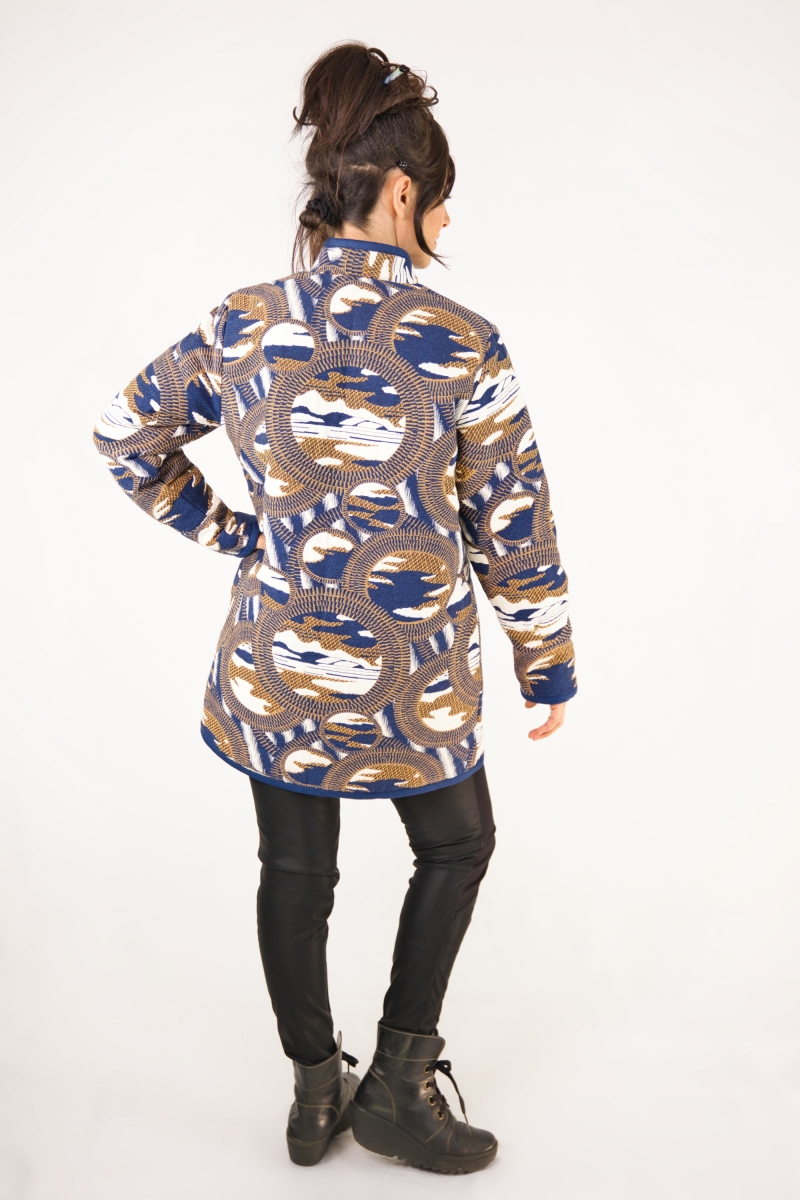 Ce Manteau d'inspiration kimono est idéal pour l'hiver: la créatrice l'a pensé suffisemment large et a choisi avec grand soin les motifs du tissu. ( Maison Deveaux )
