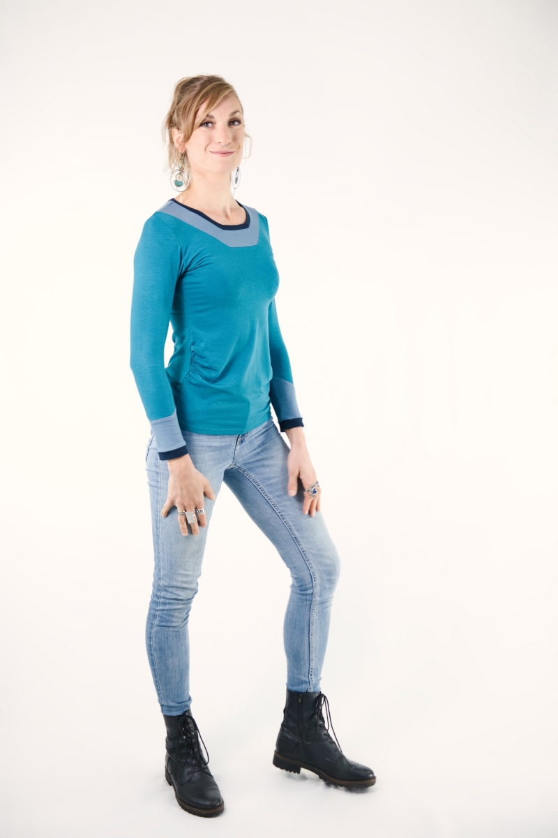 Les fronces délicates à l’avant offrent de l’aisance et une touche féminine, tandis que le jeu de trois couleurs crée un effet graphique minimaliste mais percutant.