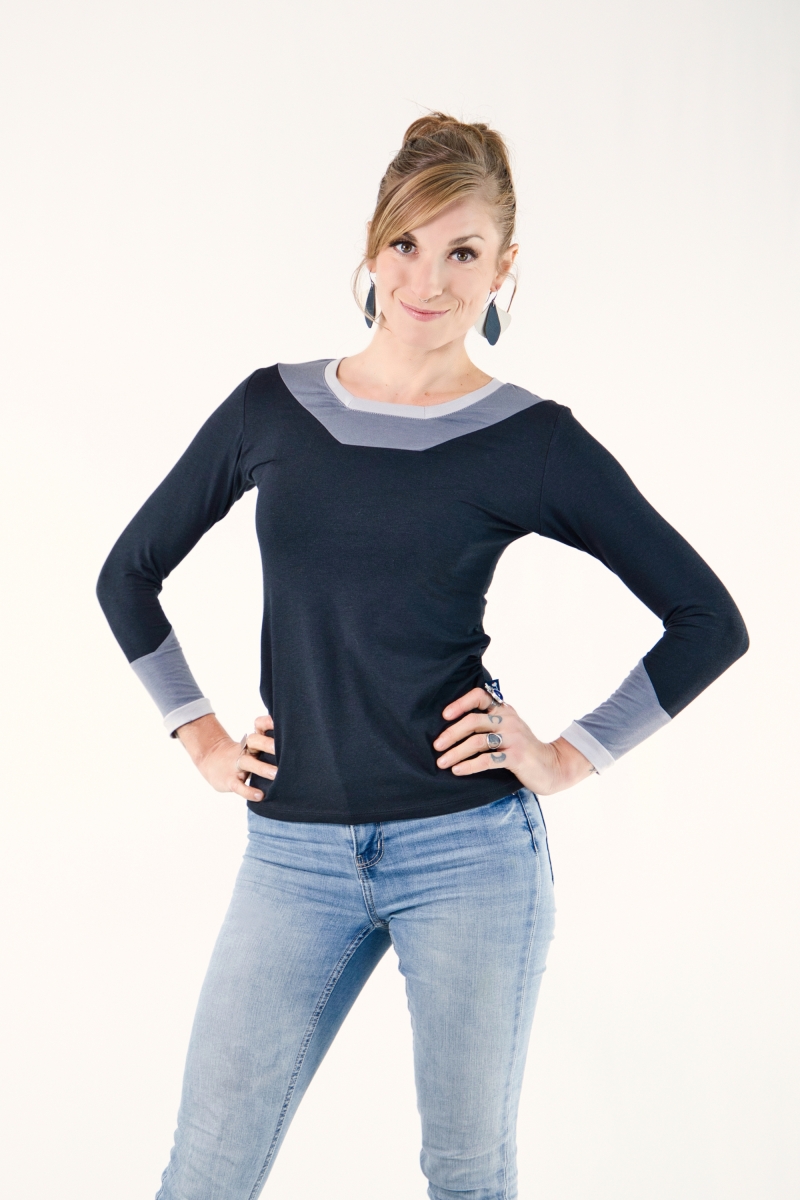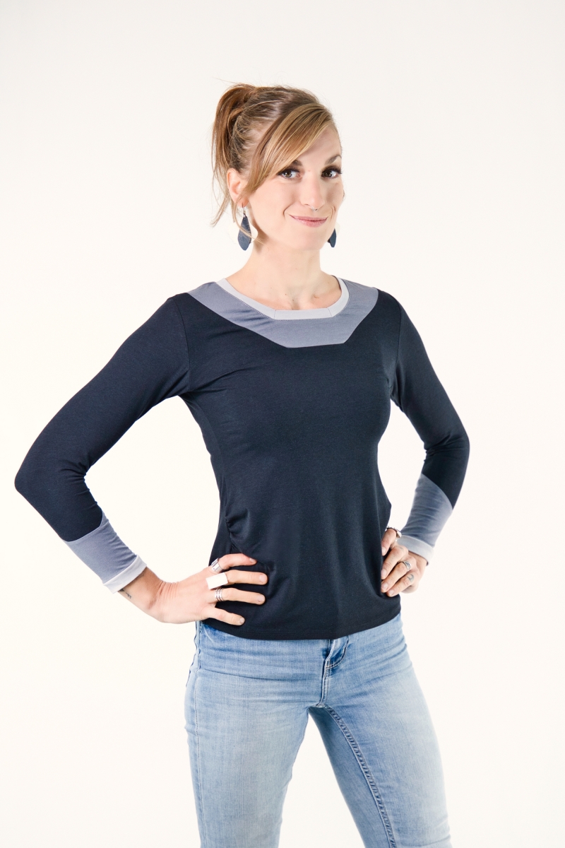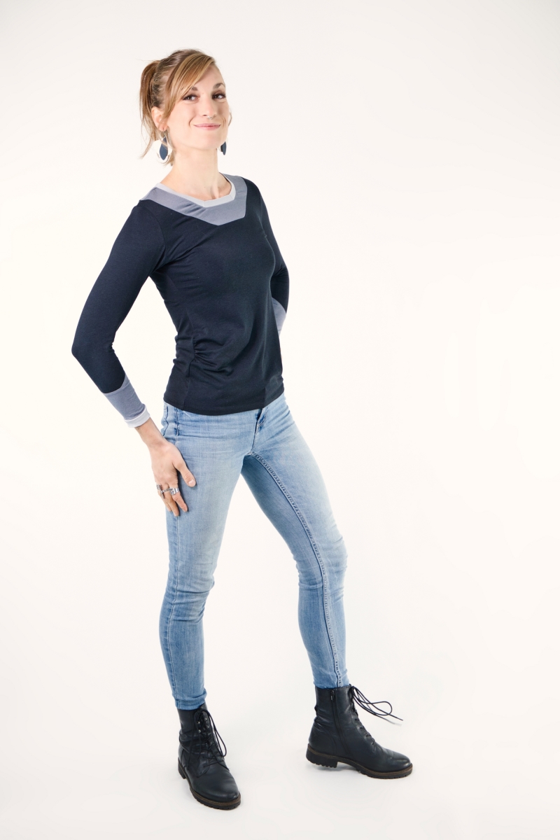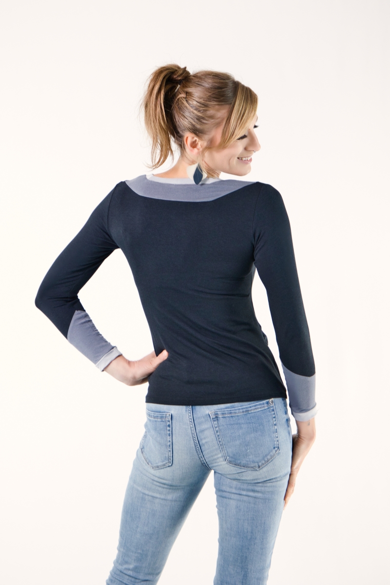 Les fronces délicates à l’avant offrent de l’aisance et une touche féminine, tandis que le jeu de trois couleurs crée un effet graphique minimaliste mais percutant.