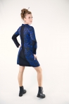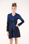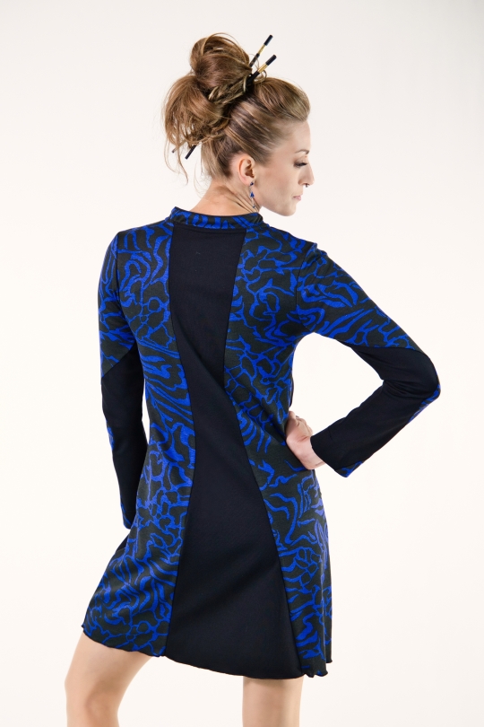 Robe bi-colore en viscose fluide, ornée d’un motif ovale au centre, écho discret sur les manches.