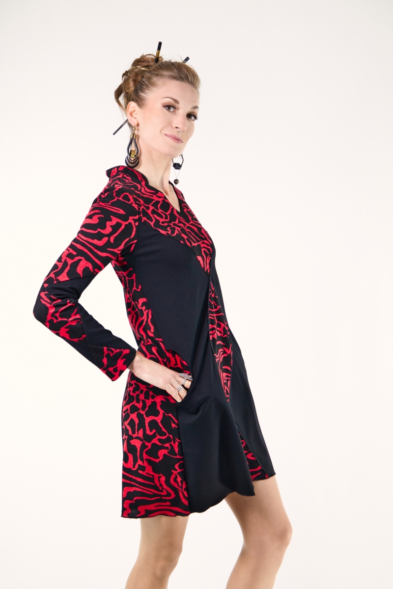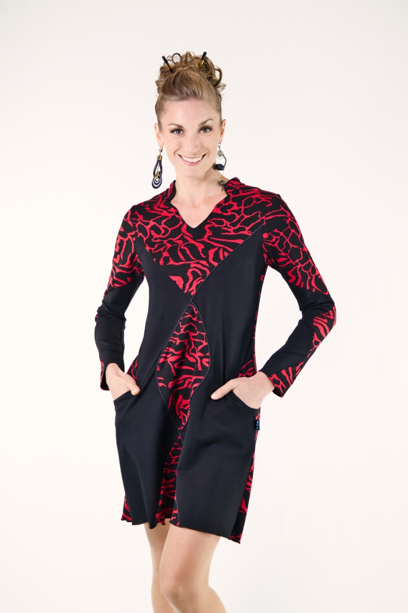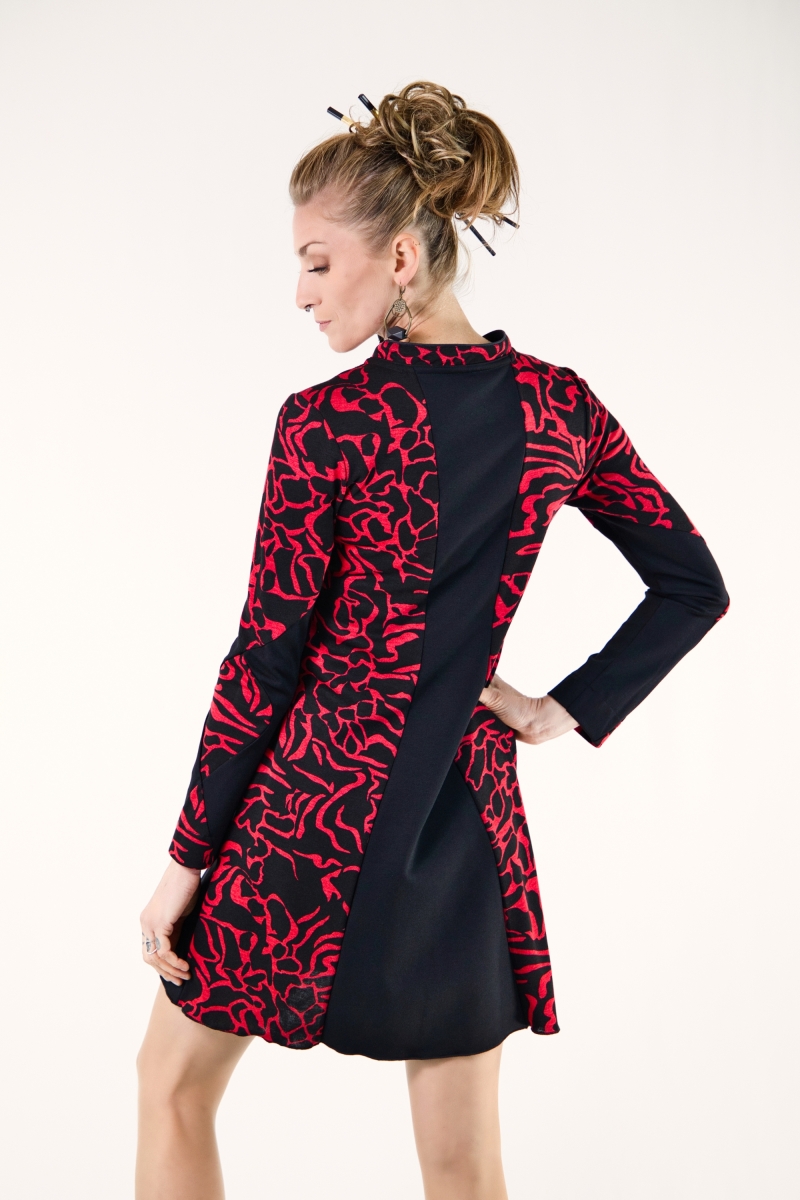 Robe bi-colore en viscose fluide, ornée d’un motif ovale au centre, écho discret sur les manches.