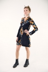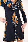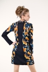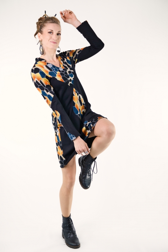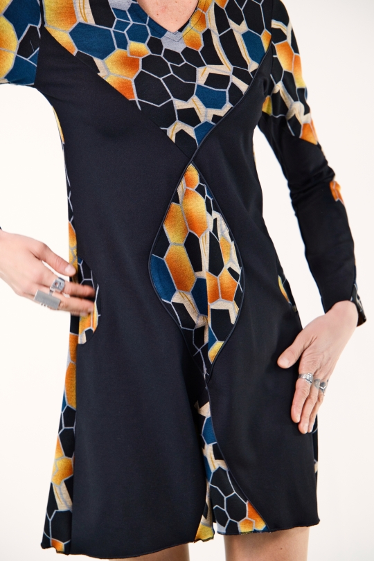 Robe bi-colore en viscose fluide, ornée d’un motif ovale au centre, écho discret sur les manches.