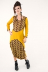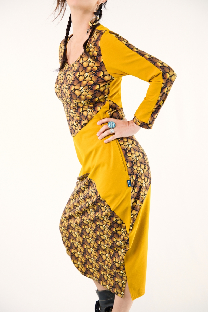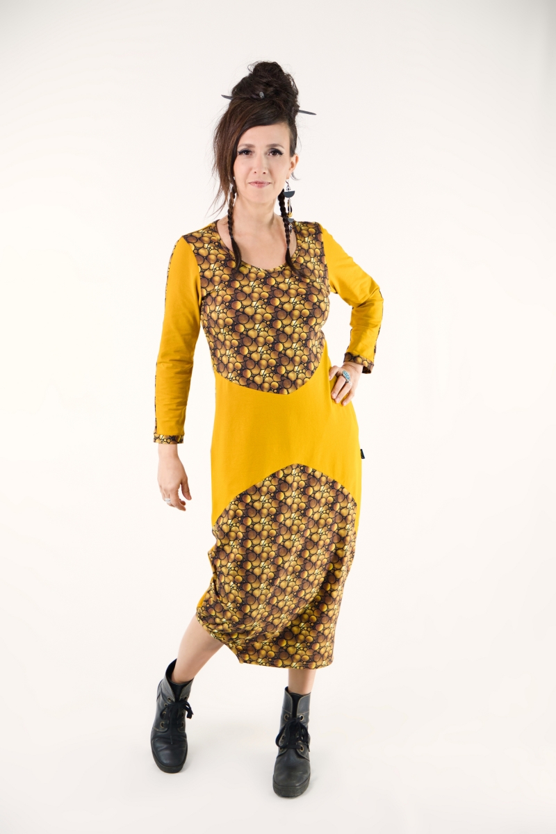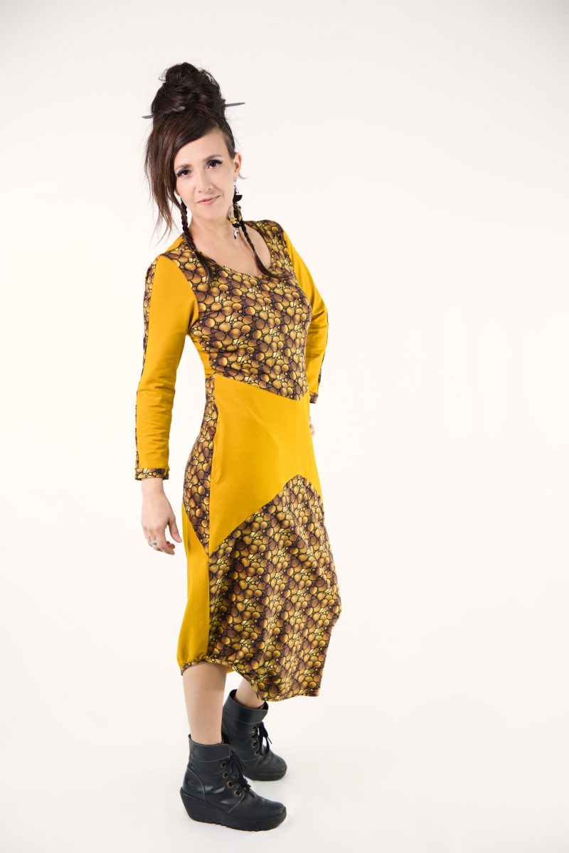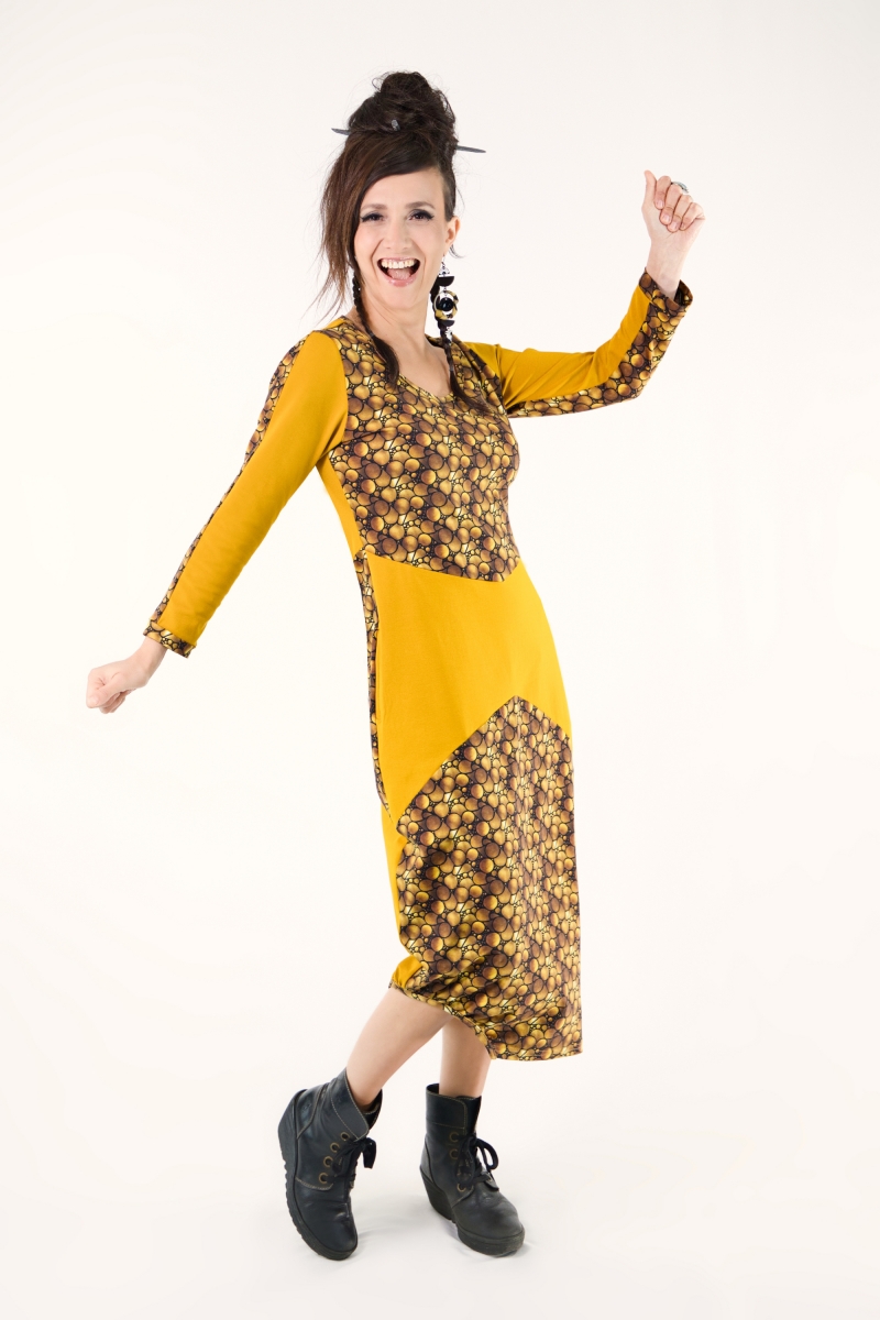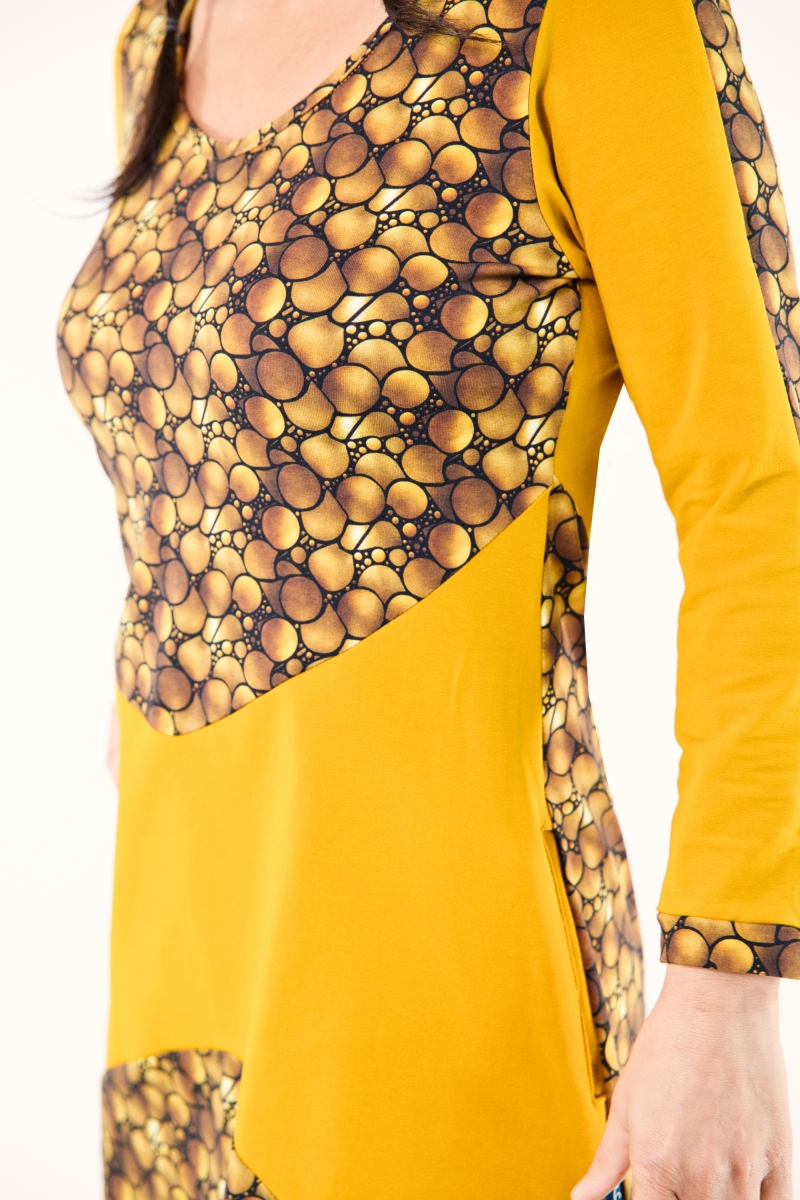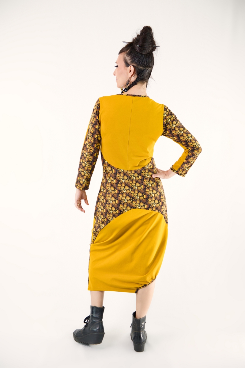 Robe mi-longue en jersey de coton OEKO-TEX, alliant motifs et tissu uni dans un jeu d’alternance harmonieux.