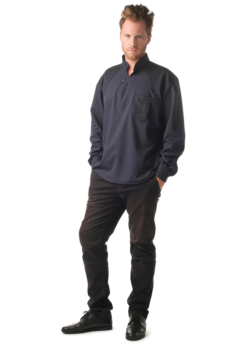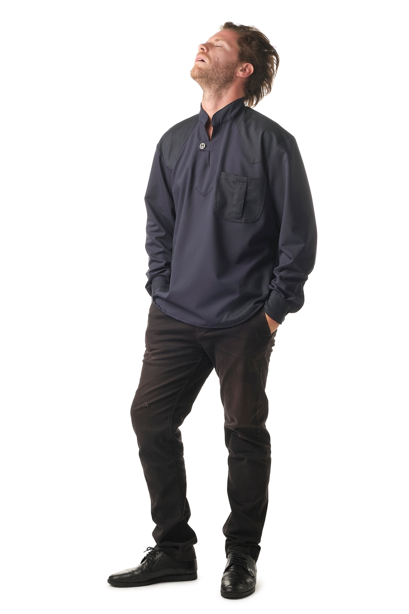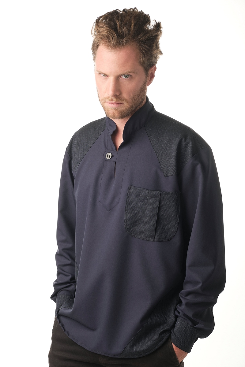 Chilia revisite la chemise homme pour un style décontracté avec son col mao et sa poche devant pour l'aspect pratique.